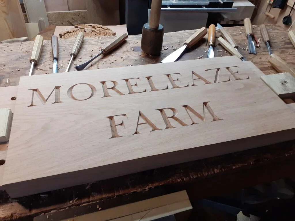 Hand carved incised lettering in oak for a farm sign