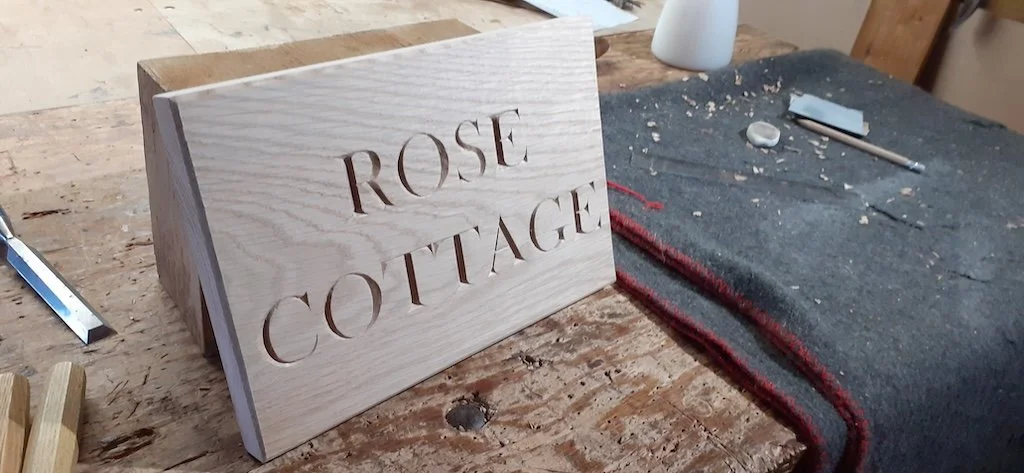 Hand carved house sign in oak to replace an old one.  The client requested the use of the Serlio typeface