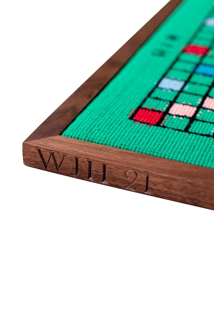 15mm incised lettering carved into a frame of an embroidered scrabble board made by Hunt & Hope