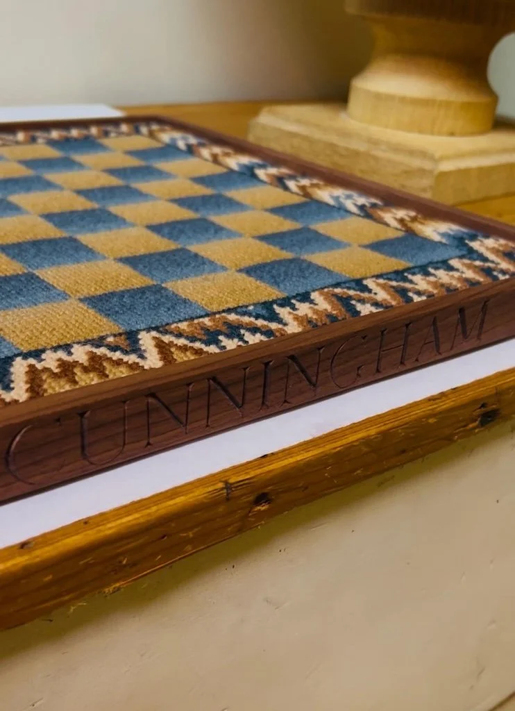 17mm incised lettering carved into a frame of an embroidered chess board made by Hunt & Hope