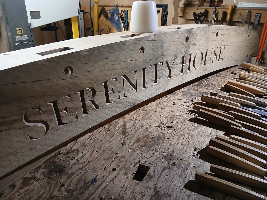 3 inch incised lettering carved onto a 2.2 metre tie-in oak beam for timber framed porch. Typeface is Baskerville
