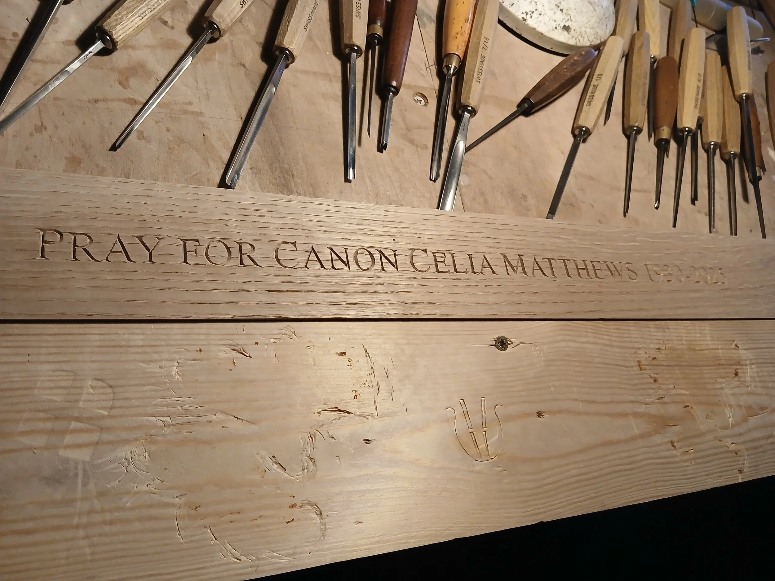 2.5 inch high incised lettering hand carved into an 8 foot 6 inch oak bench top