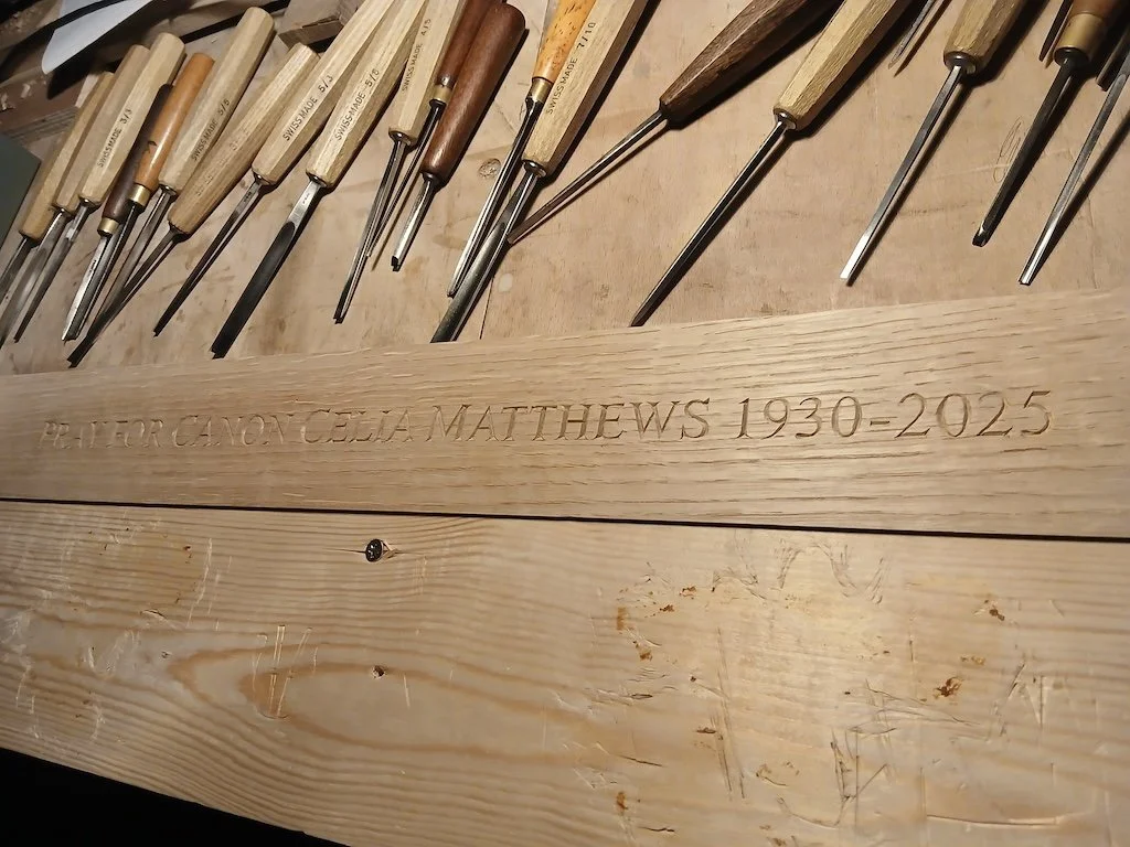 Incised lettering carved into an ash bench rail for a local joiner's client