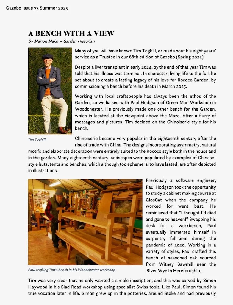 His restoration work covers both heritage and contemporary objects, and Simon says he aims to work sensitively and truthfully to the original design. He uses traditional 18th-century methods and has worked for the National Trust as well as created designs inspired by 17th and 18th-century innovators Gibbons, Chippendale and Adams.